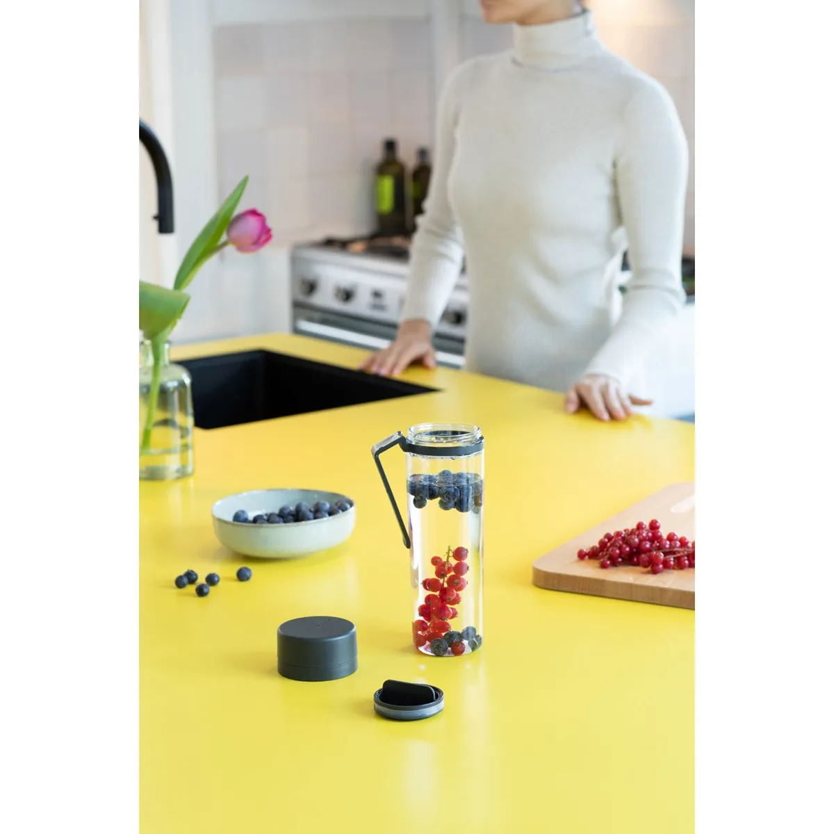 Всегда с собой - удобно брать на прогулку или на работу. Не протекает - 100% герметичность. Удобно пить - специальная форма носика. Насыщенный вкус напитка - с ситечком, позволяющим оставлять фрукты внутри. Удобно наполнять - широкое горлышко. Практично - ручка используется в качестве зажима для крепления на поясе. Хорошо видно содержимое - прозрачная бутылка. Гигиенично - в перевернутом положении для сушки бутылка размещается на ручке под наклоном . Легко мыть - можно мыть в посудомоечной машине. Надежность и качество - 5 лет гарантии и сервисное обслуживание.