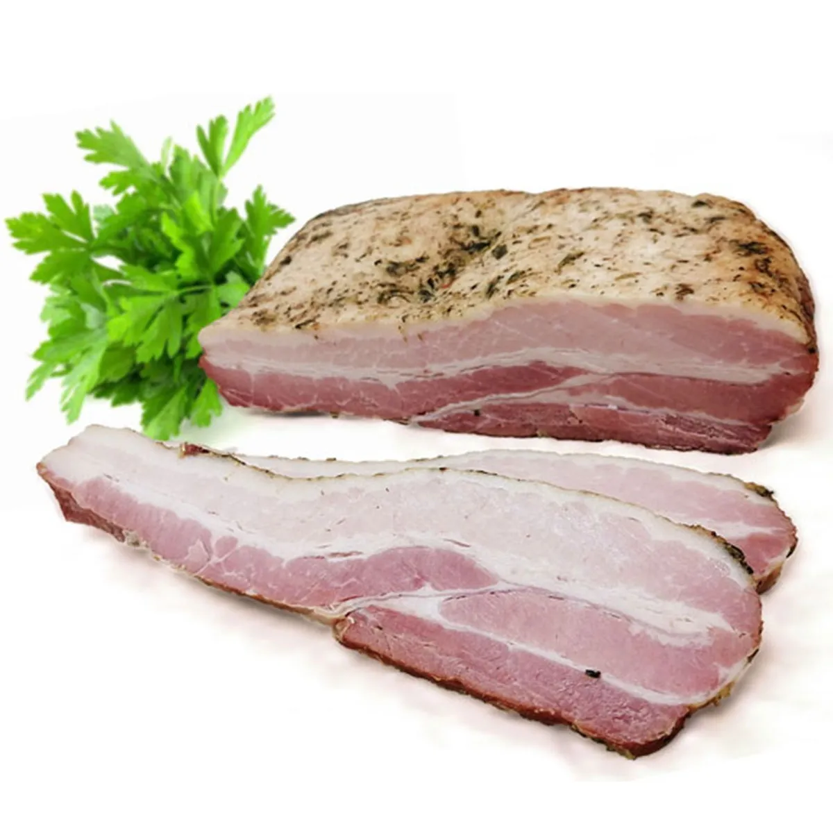 Грудинка - это деликатес, домашняя рецептура, включающая сухой посол и выбор натуральных дачных приправ- чеснока, лука, зелени петрушки, порея и базилика.