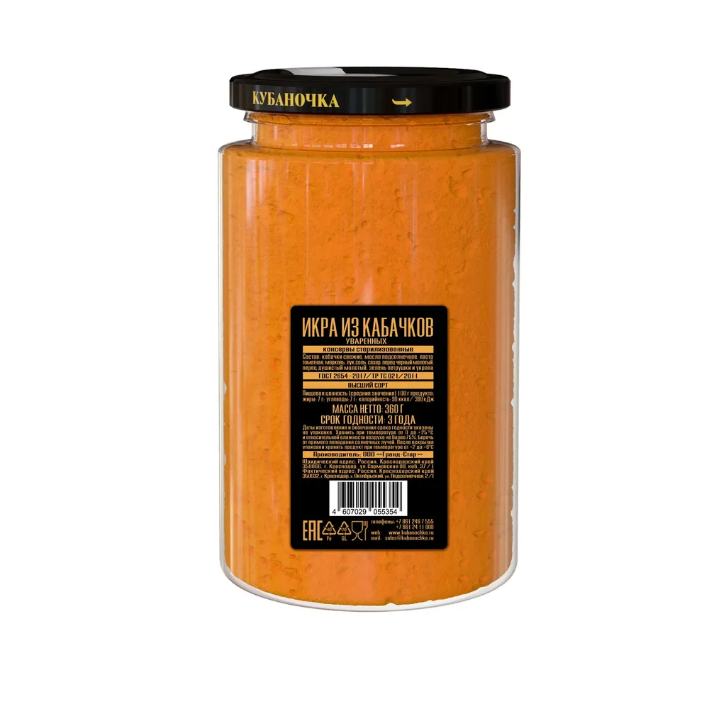 Кубаночка Икра из баклажанов, 360 г. Икра баклажанная - это настоящая находка для любителей полезной еды! Изысканный и неповторимый вкус баклажанов переносят нас в мир знакомых с детства блюд. Насладитесь аутентичным вкусом лета с икрой из баклажанов «Кубаночка»! Эта ароматная закуска приготовлена по традиционному рецепту из запеченных баклажанов, сочных томатов, репчатого лука и отборных специй. Она обладает насыщенным вкусом и нежной, бархатистой текстурой, что делает ее идеальной как для повседневного, так и для праздничного стола. Польза и универсальность в употреблении «Кубаночка» — это не только вкусно, но и полезно. Благодаря основе из баклажанов, икра богата клетчаткой, витаминами и антиоксидантами, которые способствуют улучшению пищеварения и укреплению иммунитета. Готовая к употреблению, она станет прекрасной холодной закуской, вкусным гарниром к мясу или рыбе, а также самой популярной начинкой для ваших утренних бутербродов и тостов. Почему стоит выбрать именно «Кубаночку»? Натуральный состав: Только свежие овощи и натуральные специи без искусственных добавок. Польза для здоровья: Помогает поддерживать здоровый рацион, обогащая его клетчаткой и витаминами. Невероятная универсальность: Добавьте икру в обед, намажьте на хлеб или подайте к ужину — она всегда уместна