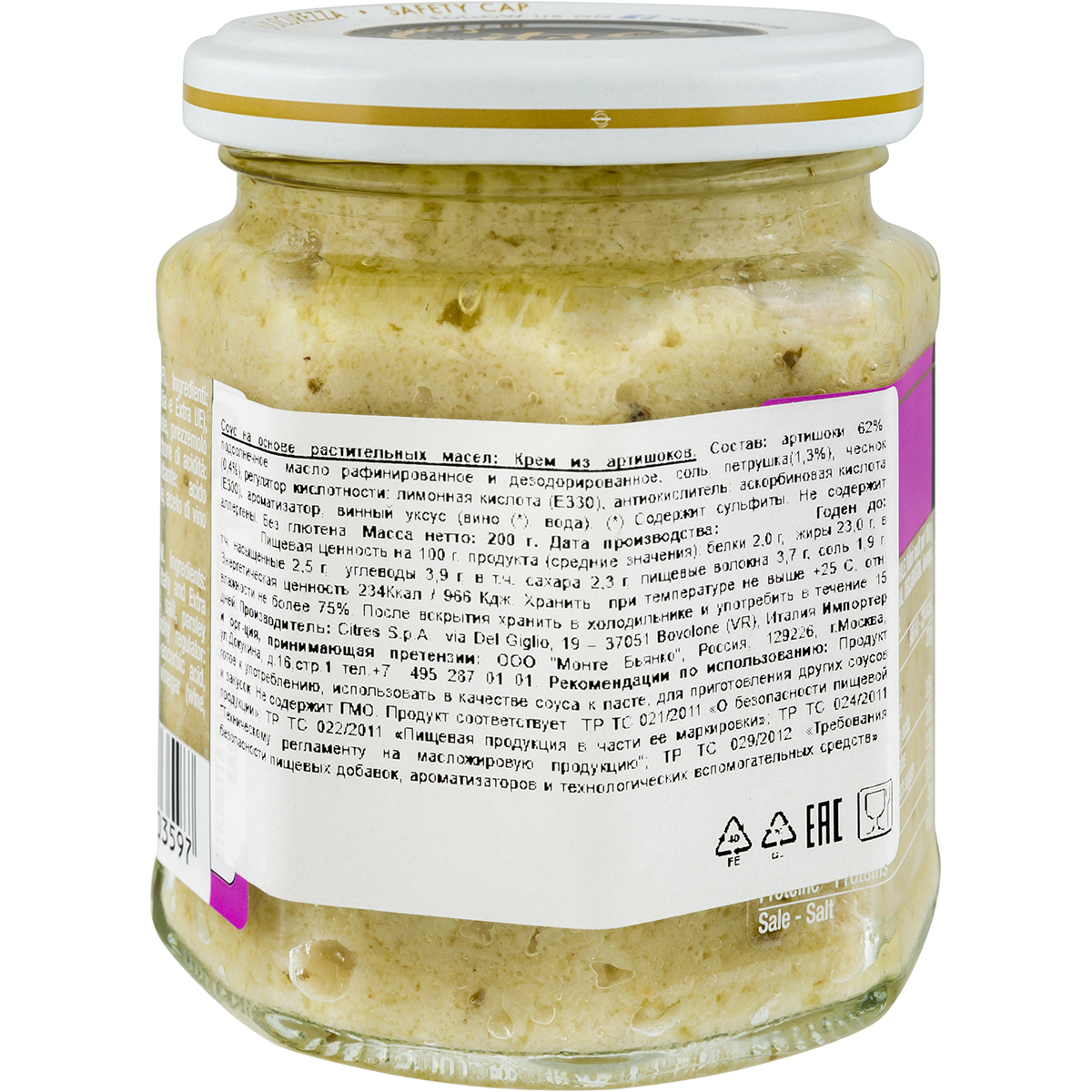 артишоки 62%, подсолнечное масло рафинированное и дезодорированное, соль, петрушка(1,3%), чеснок (0,4%), регулятор кислотности: лимонная кислота (Е330), антиокислитель: аскорбиновая кислота (Е300), ароматизатор, винный уксус (вино, вода).