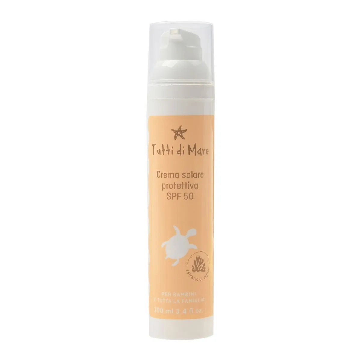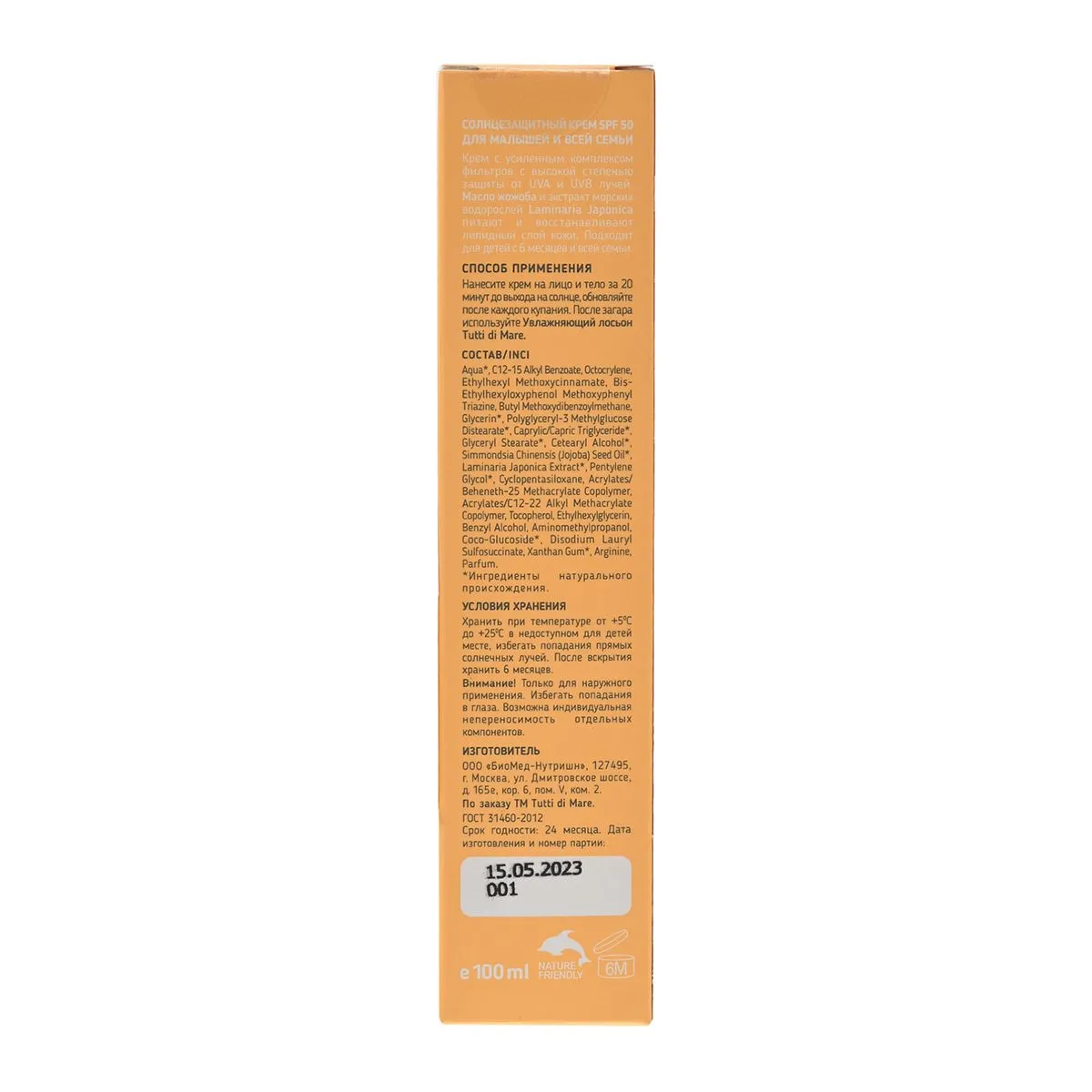 Формулы линейки Tutti di Mare Solare Protettivo ухаживают, увлажняют, защищают от обезвоживания, фотостарения и другого негативного воздействия солнца чувствительную кожу детей и взрослых. Крем с усиленным комплексом на 100% органических фильтров нового поколения с высокой степенью защиты SPF 50* от UVA и UVB лучей.Подходит для детей с 6 месяцев и всей семьи. Крем обладает более плотной текстурой, подходит для лица, шеи, плеч и других наиболее уязвимых участков тела. Не оставляет белых следов и липкости. Натуральные экстракты и масла в составе: Экстракт бурых морских водорослей Laminaria Japonica обладает противовоспалительным свойством, способствует регенерации клеток, защищает кожу от УФ-излучения. Содержит полисахариды, фукоидан, альгинаты. Более 40 микро- и макроэлементов: Са (кальций), Mg (магний), P (фосфор), Fe (железо), K (калий), I (йод), Cu (медь), Cr (хром), Z (цинк). Витамины: A, D, PP (ниацин), E, C. Масло жожоба увлажняет и питает кожу, снимает чувство стянутости. Аргинин тонизирует кожу, укрепляет гидролипидный барьер. Не содержит парабенов, силиконов и минерального масла. Солнцезащитный фактор подтвержден клиническими испытаниями по международному стандарту ISO 24444:2010. Польза моря в каждый капле!