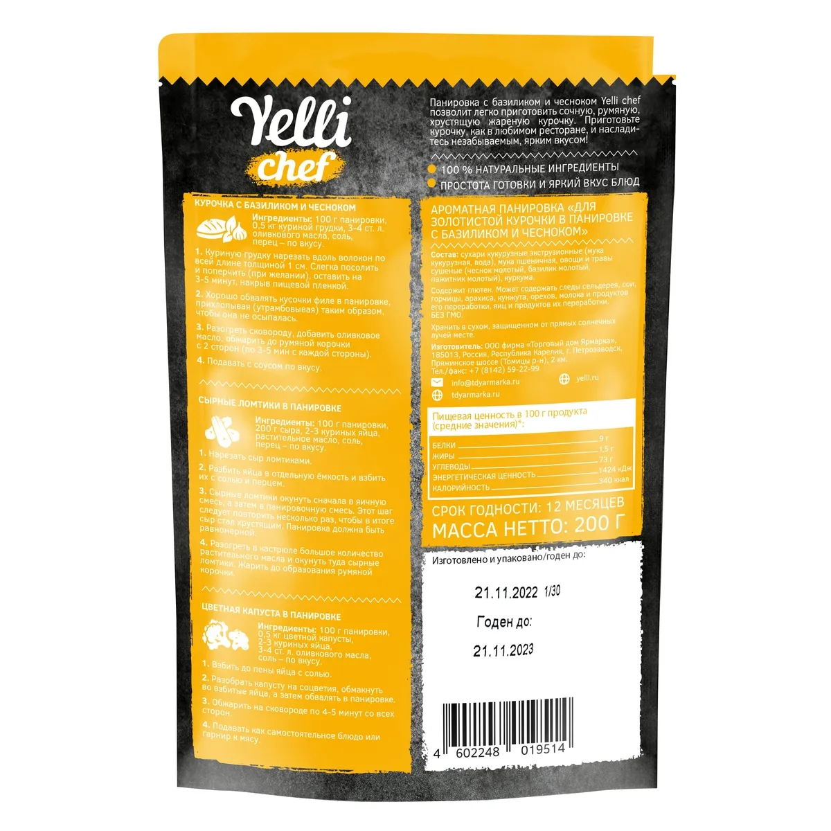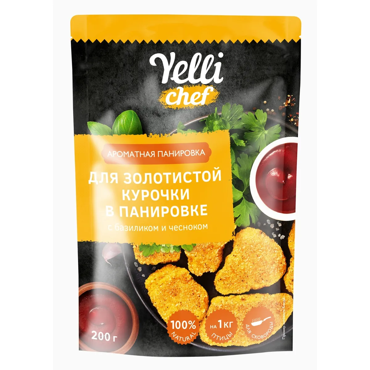 Панировка c базиликом и чесноком Yelli chef позволит легко приготовить сочную, румяную, хрустящую жареную курочку. Приготовьте курочку, как в любимом ресторане, и насладитесь незабываемым, ярким вкусом!