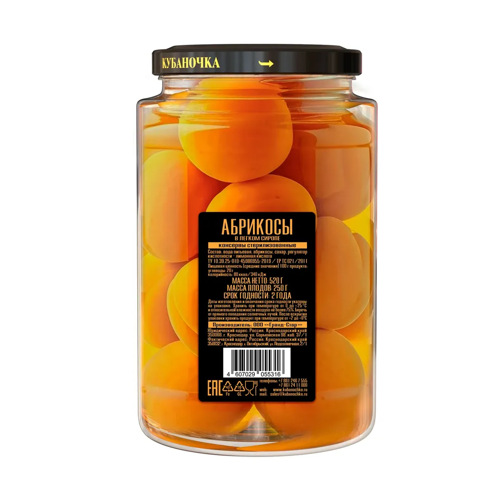 Абрикосы в легком сиропе «Кубаночка» приготовлены без добавления красителей и консервантов. 100% натуральный продукт. Выращено на экологически чистых полях в Краснодарском крае. 100% натуральный продукт. Выращено на экологически чистых полях в Краснодарском крае. В производстве продукции ТМ Кубаночка используются высококачественные материалы, которые создают неповторимый внешний вид, сохраняющийся при дальних транспортировках. Сочетание современного оборудования от лучших мировых и российских производителей и использование прогрессивной технологии изготовления растительных масел без применения экстракции позволяют выпускать продукцию высокого качества.