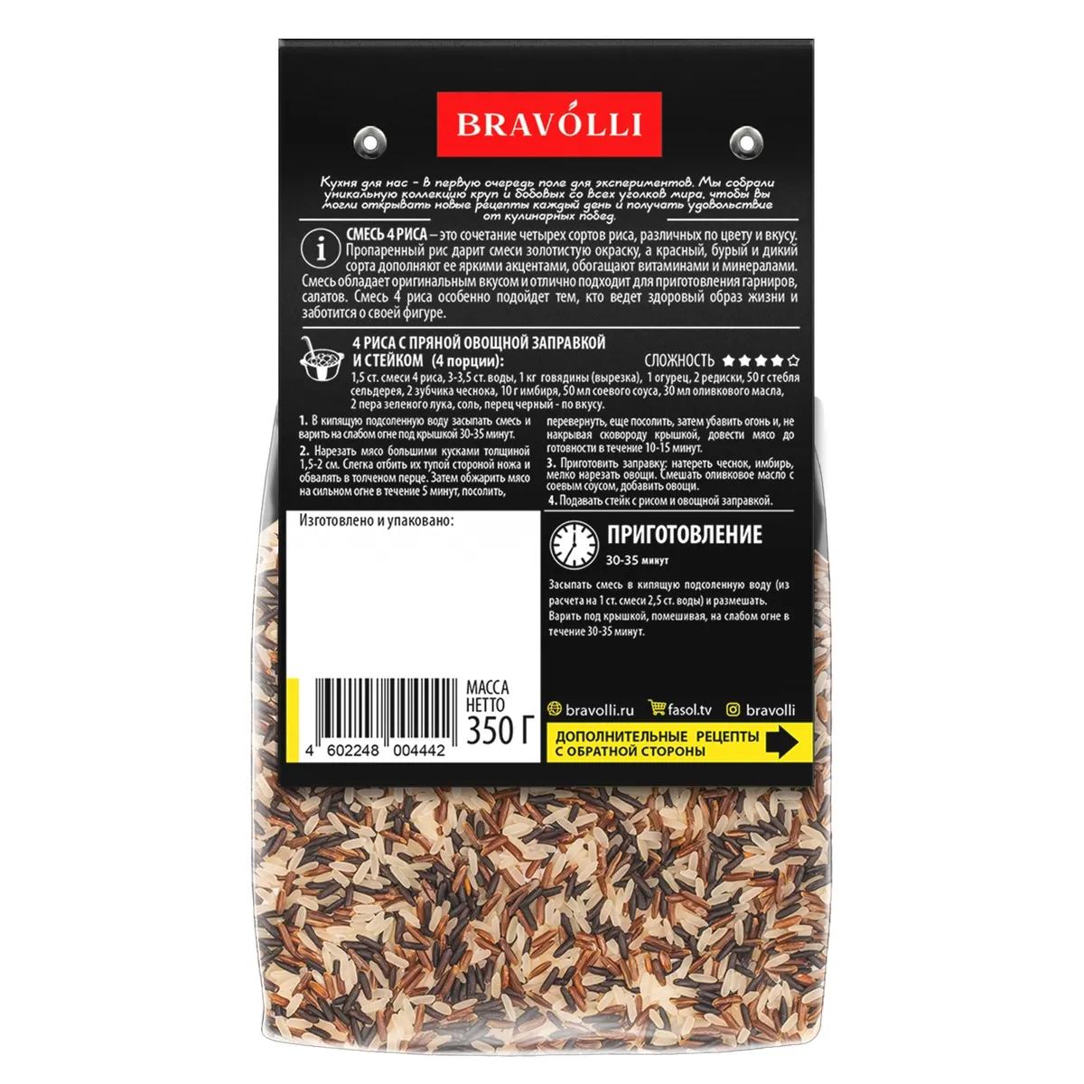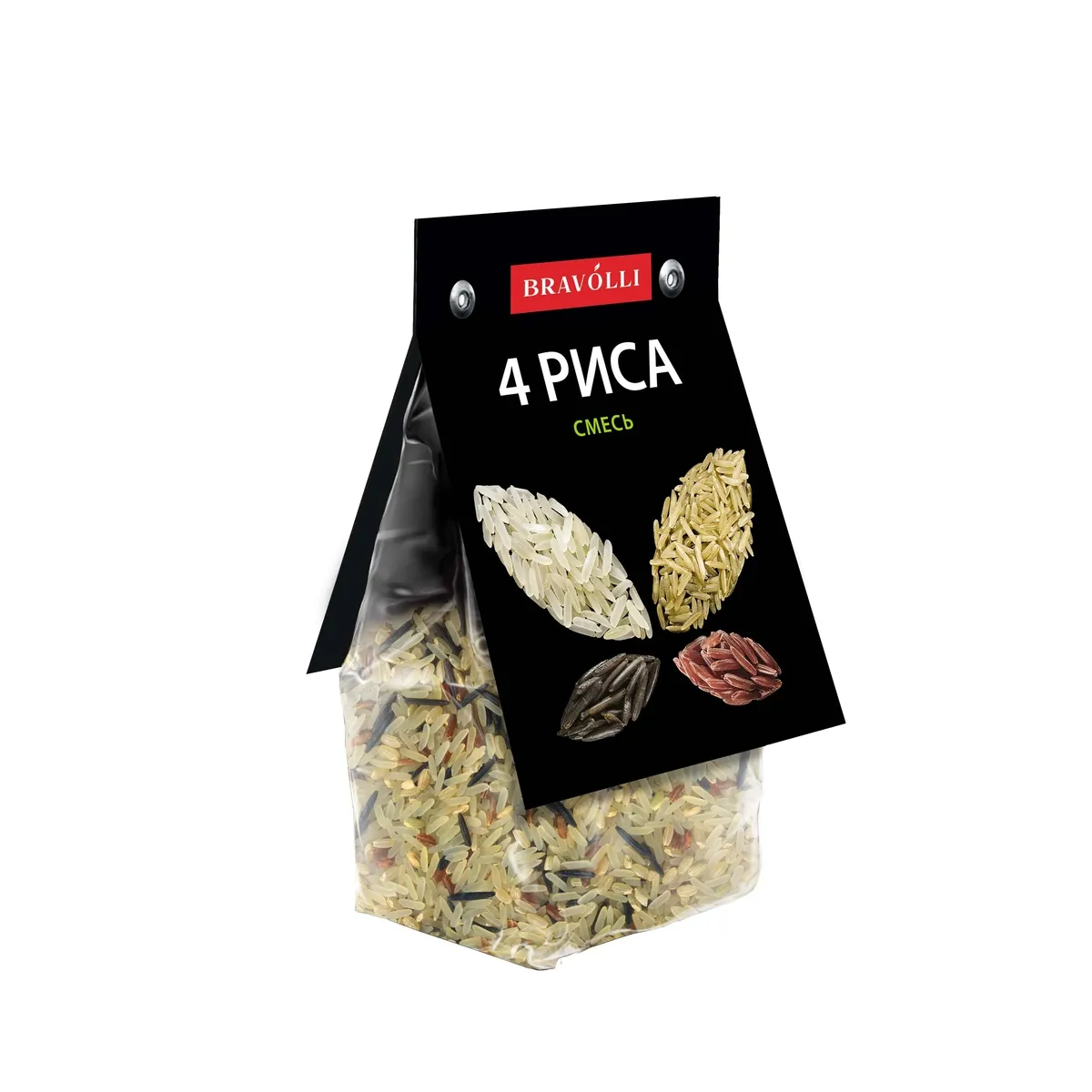 Сочетание четырех сортов риса, различных по цвету и вкусу: бурого, дикого, пропаренного, красного. Простая и универсальная в использовании смесь, отличный вариант для приготовления полезных и питательных гарниров и салатов.