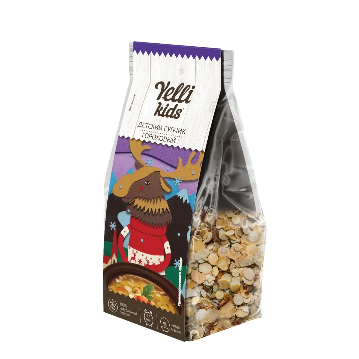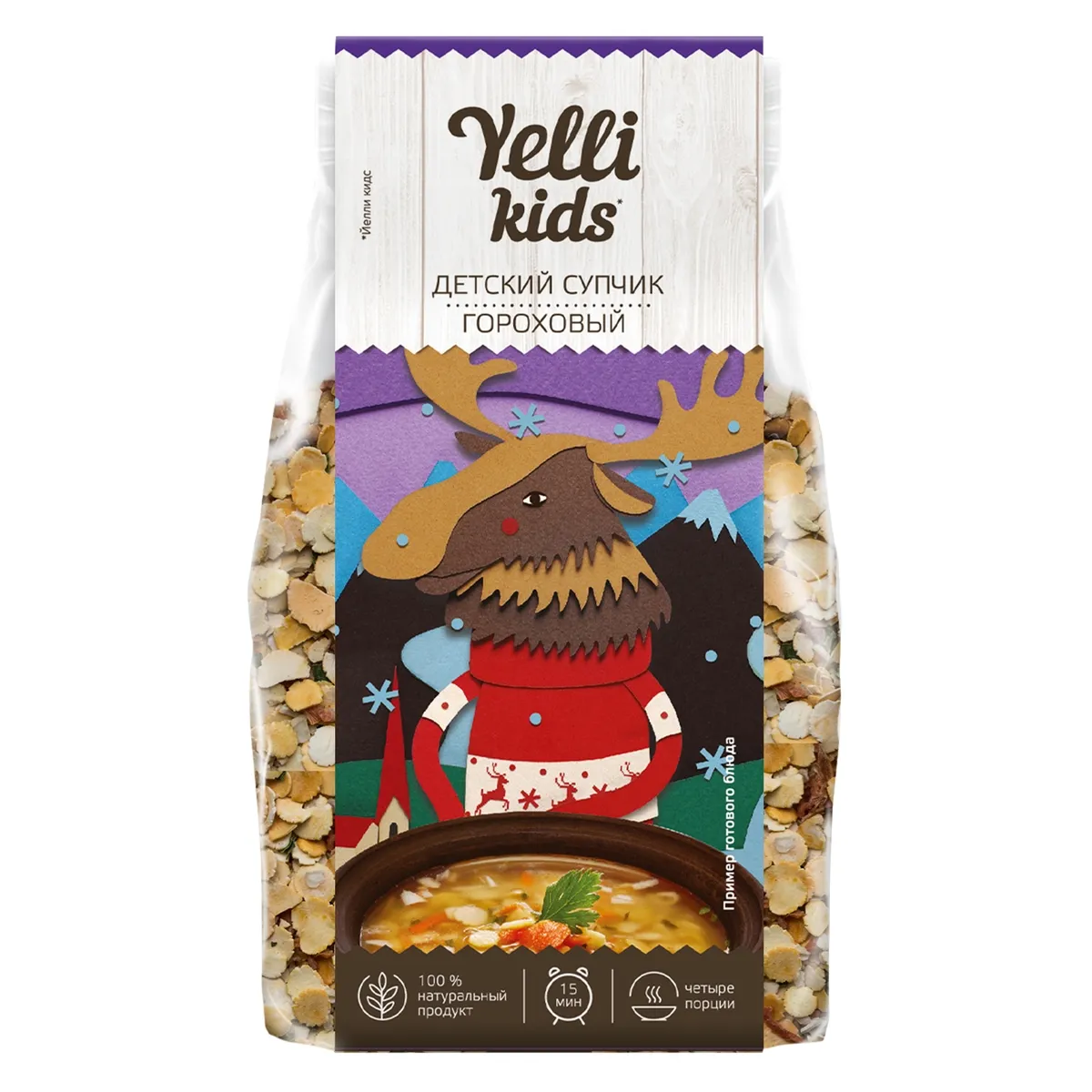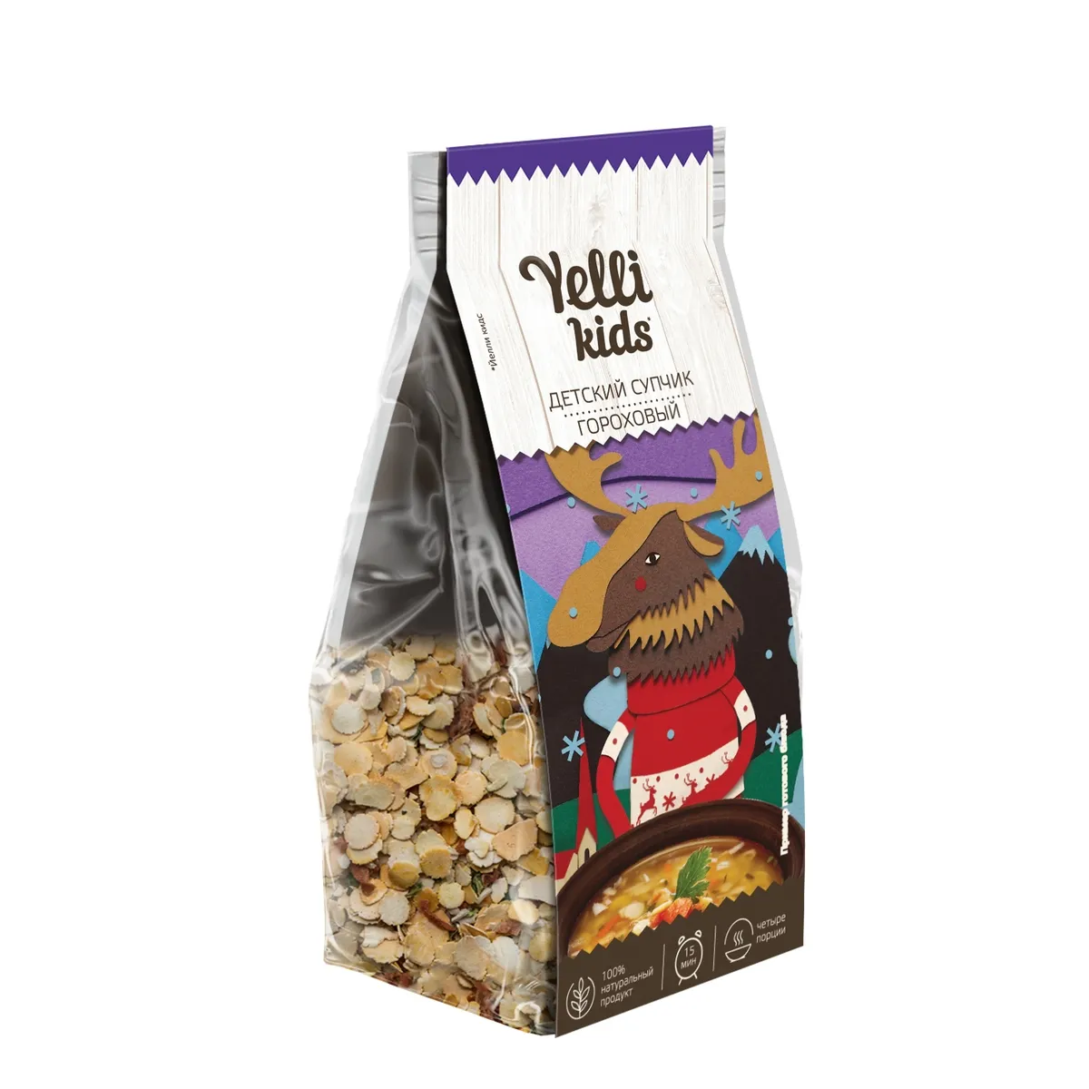 Наши дети - это маленькие исследователи. Мы хотим, чтобы они были здоровы, радовались жизни, делали новые открытия! Yelli Kids помогает открывать новые вкусы, заботится о здоровье малышей и экономит время родителей. Суп гороховый – нежный суп из гороховых хлопьев, который готовится всего за 15 минут. Вы можете сварить его на бульоне или воде. Красивые желтые лепестки гороха привлекут внимание ребенка! Легенда: В Швеции холодные и снежные зимы. Чтобы не замерзнуть, лось Марти связал себе теплый красный свитер с необычным узором. Шведам так понравился свитер с оленями, что они попросили Марти связать всем такие же. Лось Марти любит вязать, поэтому с радостью согласился. Тем более, в благодарность за свитеры каждый день ему приносят его любимый суп.
