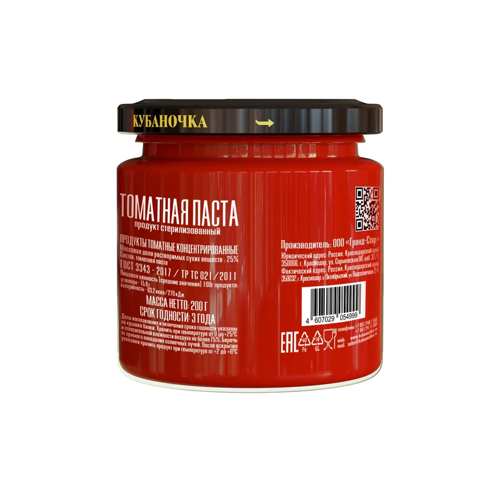 Кубаночка Паста томатная с/б, 200 грамм. Томатная паста Кубаночка изготовлена из спелых томатов, выращенных в Краснодарском крае. Натуральный продукт. Гарантированно высшее качество ГОСТ.