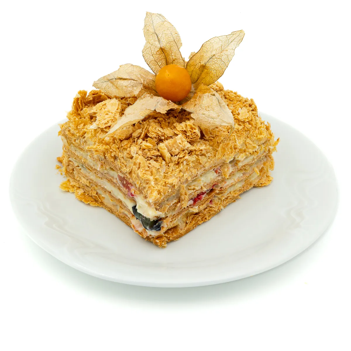 Состав: тесто слоеное б/дрожж, сливки, молоко, сахар, мука, яйцо курин, крахмал кукуруз, малина, голубика, клубника