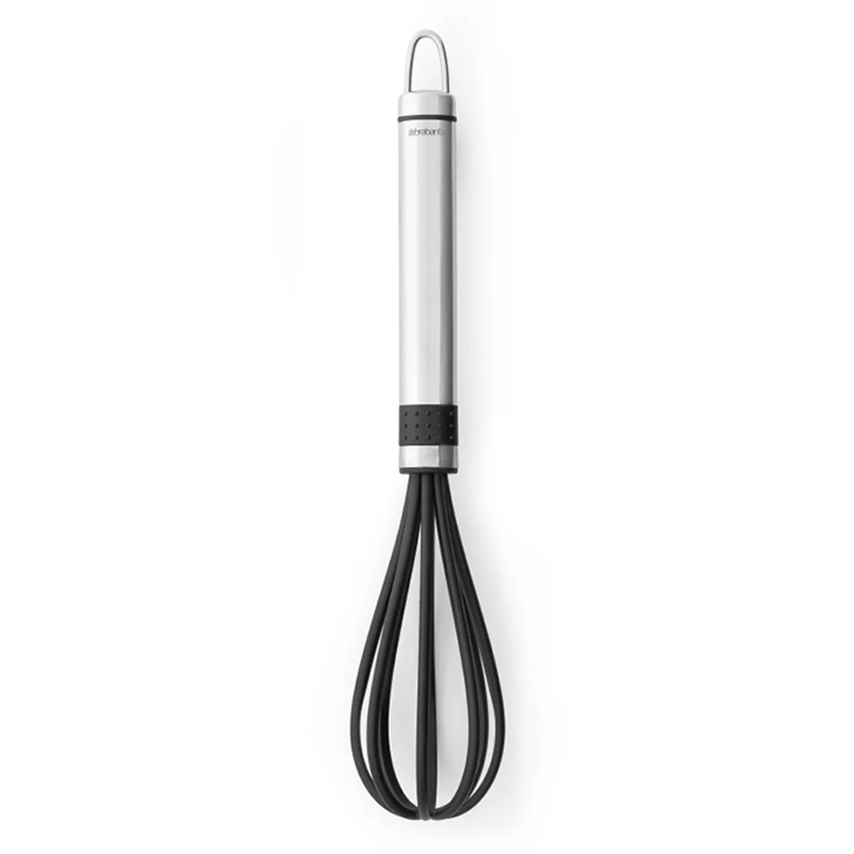 Удобный венчик для взбивания в маленьких мисках и чашках. Специально для посуды с антипригарным покрытием – эластичный пластик. Длительный срок службы – огнеупорный нейлон (макс. 220°C). Ручка выполнена из нержавеющей стали. Можно мыть в посудомоечной машине.